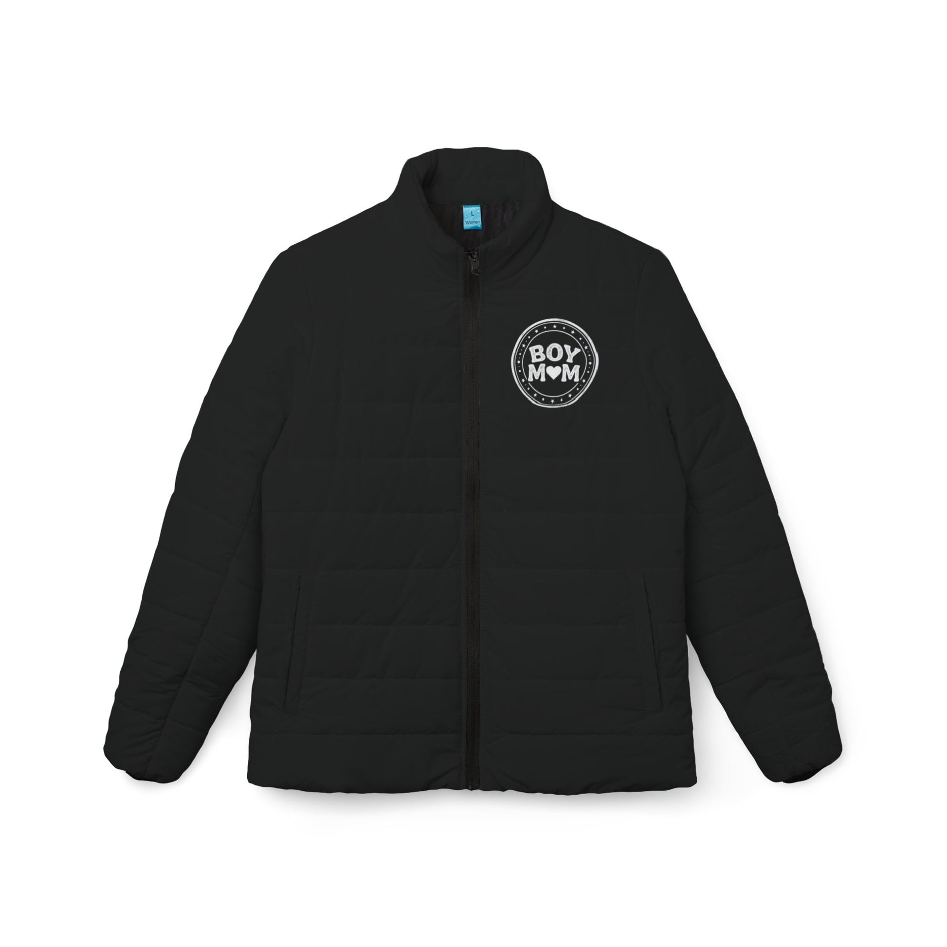 - Women's Black Puffer Jacket with 'BOY MOM' Logo — Lightweight Quilted Coat (XS–3XL)